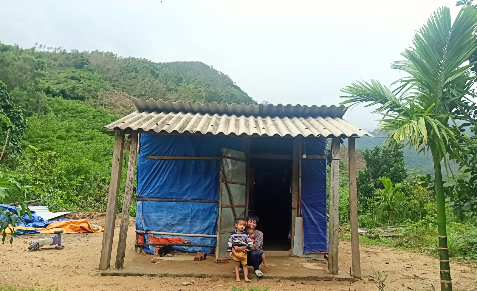 “Trước đây, mỗi lần bão tới, mấy mẹ con em lại phải ra chuồng gà ngủ vì chỉ có chỗ đó mới đảm bảo an toàn, chứ nhà cửa hồi đó lụp xụp lắm,” Lâm nhớ lại. Là một trong những hộ nghèo của huyện Long Sơn, Lâm, Tuấn và hai con nhỏ cùng trú trong căn lán dựng tạm từ hồi hai anh chị mới kết hôn. Vì không có nghề nghiệp ổn định, thu nhập bấp bênh, Lâm và Tuấn không dám mơ tới việc sửa sang, gia cố lại căn nhà dù mỗi lần bão về, chỉ cần một cơn gió to cũng khiến ngôi nhà rung lên từng chập.