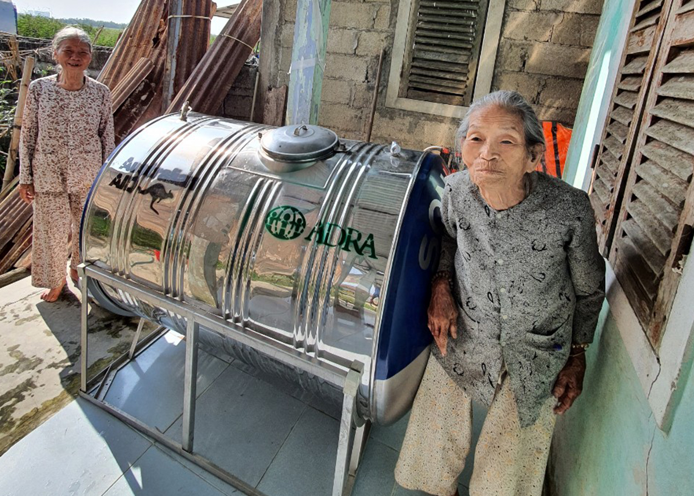 Nước đó chỉ đủ nấu ăn chứ không có nước để tắm hay tưới rau. Tháng Giêng vừa rồi tôi nhận được bồn nước 1000L từ ADRA Việt Nam. Nhân viên của ADRA nói với tôi rằng đó là quà của Chính phủ Úc và họ giải thích rằng sử dụng bồn inox an toàn cho sức khỏe hơn xô nhựa. Tôi vô cùng biết ơn và vui lắm”.