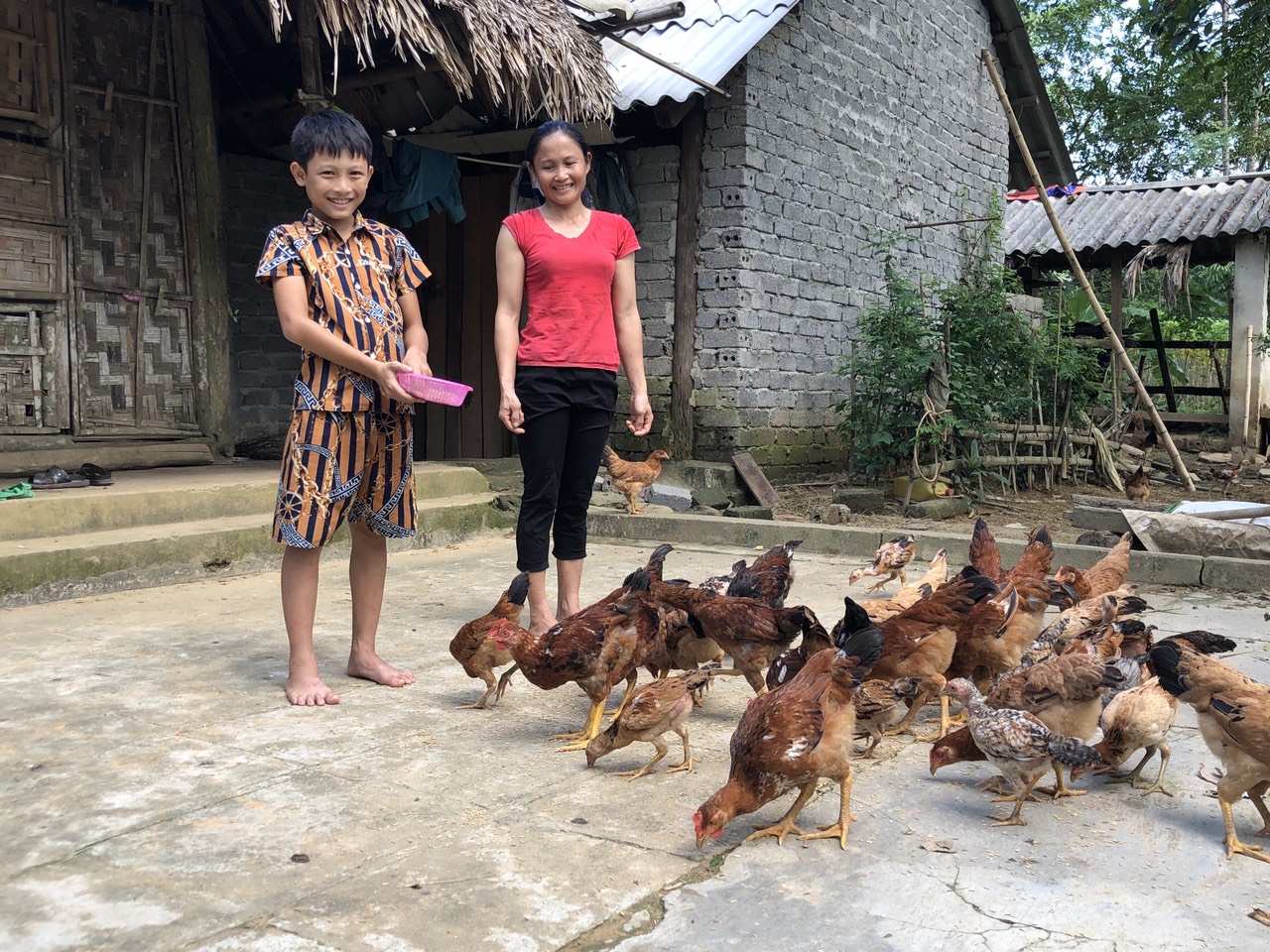 Thuan and his mother with their chickens in the yard. Photo: World Vision.