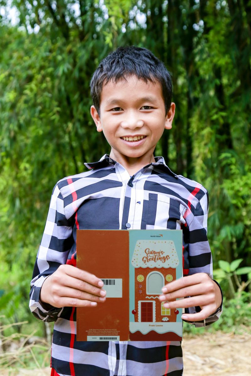 Chư (13 tuổi) - trẻ bảo trợ của World Vision Việt Nam tại huyện Tủa Chùa, tỉnh Điện Biên – “khoe” tấm thiệp em mới nhận được từ bác Jo và John, người bảo trợ của em từ Úc.