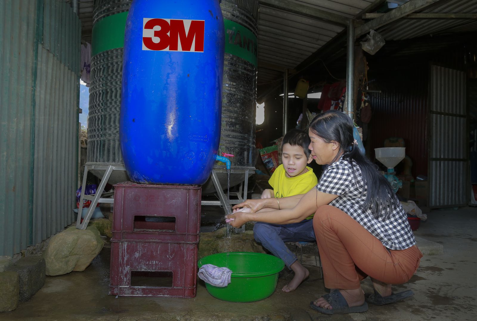 Ms. Thanh and her second son, Nghia, enjoyed clean water from the filtration.