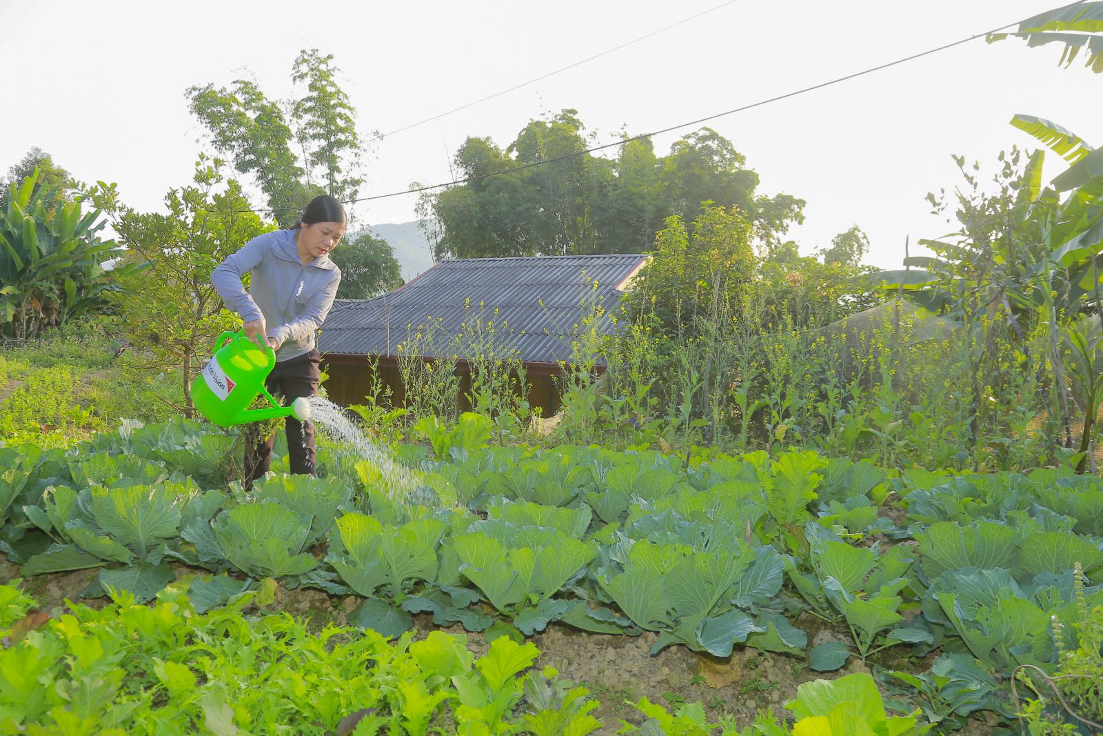Ms. Thanh taking care of her family’s vegetable garden with the safe source of water.